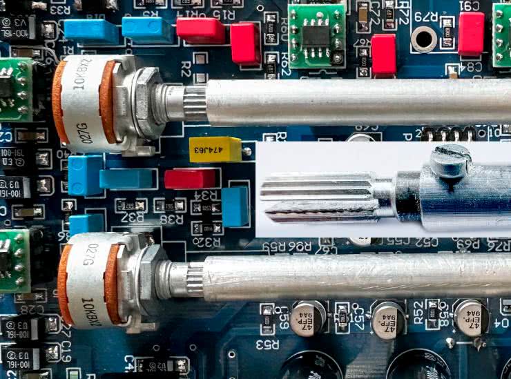 Przedłużacz jest na tyle długi, że wymaga podparcia od strony pokrętła. Można to zrobić w płycie czołowej. Ja wykorzystałem do tego celu płytkę sterownika, która jest docelowo trwale połączona pod kątem prostym z główną płytką układów analogowych za pomocą kątowych goldpinów. To połączenie, oprócz funkcji mechanicznych, łączy obie płytki elektrycznie (złącze J2 płytki analogowej) W płytce sterownika są wywiercone w odpowiednim miejscu dwa otwory o średnicy 8 mm, przez które przechodzą rurki przedłużacza. Takie "łożyskowanie" wydaje się zupełnie wystarczające dla normalnej eksploatacji - fotografia 2. Potencjometry barwy w odróżnieniu od potencjometrów siły głosu są przestawiane dużo rzadziej. Dopiero po połączeniu obu płytek wkładamy przedłużacz i po ustawieniu całości wlutowujemy potencjometry filtrów barwy.
