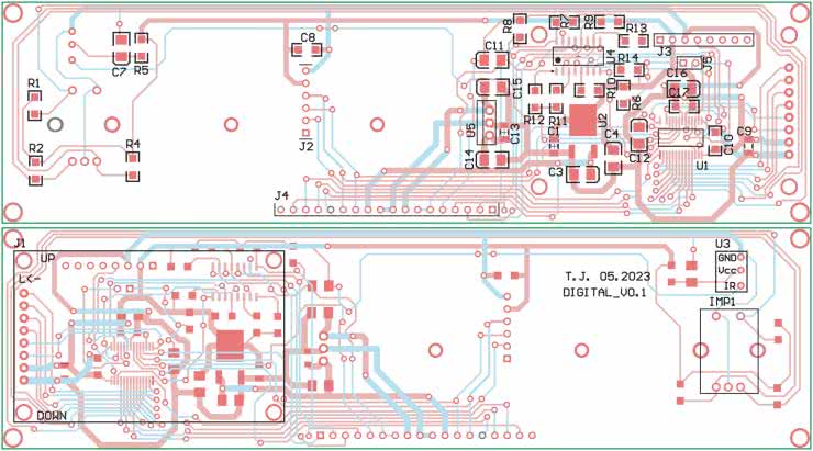 Rysunek płytki sterownika został pokazany na rysunku 16. Najtrudniejszym elementem do montażu ze względu na mały rozstaw wyprowadzeń jest mikrokontroler Atmega4808. Po wlutowaniu trzeba dokładnie sprawdzić, czy nie ma zwarć pomiędzy wyprowadzeniami i czy wszystkie wyprowadzenia są dobrze przylutowane. Jest to o tyle ważne, bo po połączeniu z płytką układów analogowych dostęp do mikrokontrolera zasłania jeden z transformatorów sieciowych i poprawki są bardzo utrudnione, a wręcz niemożliwe bez rozlutowania obu płytek lub wylutowania transformatora.