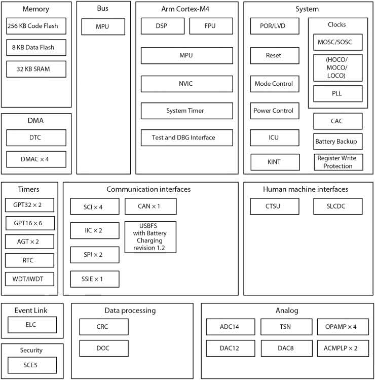 Identycznie jak w Arduino UNO R4, nakładka zawiera procesor R7FA4M1AB3CFM z rodziny R4M firmy Renesas, którego budowę pokazano na rysunku 1. Układ zawiera 32-bitowy rdzeń ARM M4 taktowany zegarem do 48 MHz, jest wyposażony w jednostkę FPU i bogate peryferia. Pozwala to na znaczące zwiększenie wydajności i możliwości aplikacyjnych w porównaniu z UNO R3.