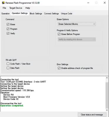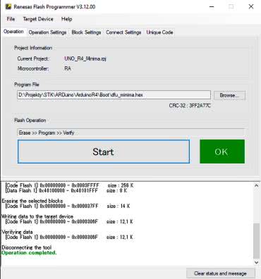 Zgodnie z rysunkami 4 i 5 należy ustawić opcje połączenia: Connect Settings oraz programowania: Operation Settings. Następnie w zakładce Operation należy wybrać aktualną ścieżkę bootloadera dfu_minima.hex i rozpocząć programowanie (rysunek 6) po przyciśnięciu przycisku RES na płytce AVTDuino UNO R4 Plus. W przypadku problemów z zaprogramowaniem należy powtórzyć całą procedurę.