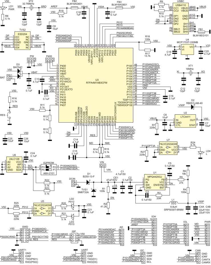 - U3: R7FA4M1AB3CFM (LQFP64)