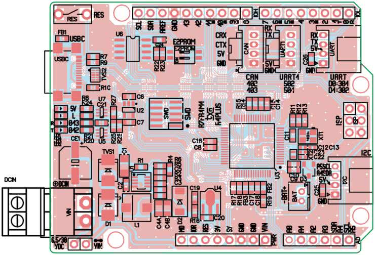 Schemat AVTDuino UNO R4 Plus został pokazany na rysunku 2. W porównaniu do wersji Minima całkowicie zmieniony został obwód zasilania. Zewnętrzne zasilanie poprzez rozłączane złącze śrubowe DCIN typu MC1.5 doprowadzone jest do przetwornicy obniżającej U1 typu MPQ4420. Układ ten wybrano ze względu na szeroki zakres napięcia zasilania, względnie prostą aplikację i przystępną cenę. Układ pracuje w fabrycznej aplikacji. Zakres napięcia zasilania, przy którym przetwornica pracuje poprawnie, to 6,5...30 V, więc nieco więcej niż w przypadku UNO R4. Dioda Schottky’ego D1 zabezpiecza układ przed odwrotnym podłączeniem zasilania, transil TVS1 przed skutkami przepięć. Kondensatory CE1, C1, C2 zapewniają filtrację zasilania.