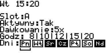 Tryb Menu ustawień pozwala nam na dokonanie ustawień zarówno bieżącej godziny i dnia tygodnia, jak i skonfigurowanie ustawień dla każdej "przegródki" oznaczonej tu jako "Slot". Ustawienia, o których mowa powyżej, to: aktywność "przegródki" (gdyż można ją wstępnie skonfigurować, ale jeszcze nie aktywować), dzienna liczba dawek leku (1…5), godziny przyjmowania leku (dowolne z zakresu 0…23) oraz dni tygodnia przyjmowania leku. Poruszanie się pomiędzy elementami poddawanymi edycji, jak i ich edycję umożliwiają krótkie naciśnięcia przycisków funkcyjnych, zaś poruszanie się pomiędzy wierszami opcji Menu ustawień umożliwiają długie naciśnięcia przycisków UP i DOWN.