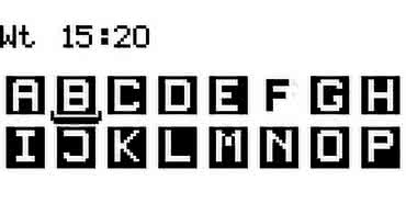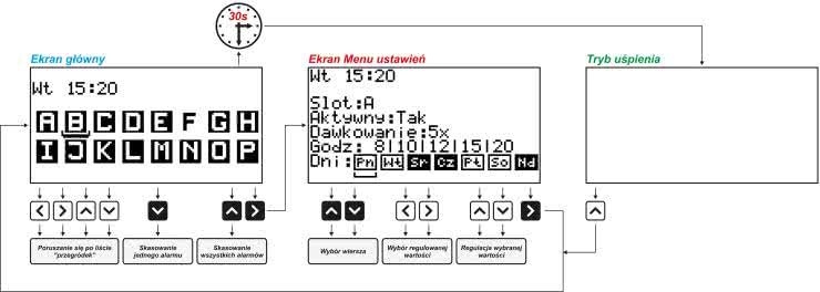 W ramach systemu Menu dostępne są 2 ekrany użytkownika: ekran Menu głównego oraz ekran Menu ustawień. Poniżej, na rysunku 6, pokazano ekran Menu głównego urządzenia e-Nurse, zaś na rysunku 7 pokazano ekran Menu ustawień naszego urządzenia. Jak widać, w ramach Menu głównego dostępna jest informacja o bieżącej dacie i godzinie systemowej oraz informacja o aktywnych alarmach (aktywność alarmu pokazywana jest w postaci wypełnienia wybranego symbolu "przegródki"). Z tego poziomu dokonujemy potwierdzenia przyjęcia dawki leku, co skutkuje skasowaniem alarmu, posiłkując się przy tym przyciskami funkcyjnymi umożliwiającymi poruszanie się po liście ikonek alarmów (przesuwającymi podkreślenie konkretnego symbolu "przegródki") oraz ich kasowanie. Kasowanie może przebiegać w dwojaki sposób: długie przyciśnięcie przycisku DOWN kasuje jeden alarm dla danej "przegródki", zaś długie przyciśnięcie przycisku UP kasuje wszystkie alarmy dla tejże "przegródki". Dodatkowo, długie przyciśniecie przycisku NEXT wprowadza nas w tryb Menu ustawień.