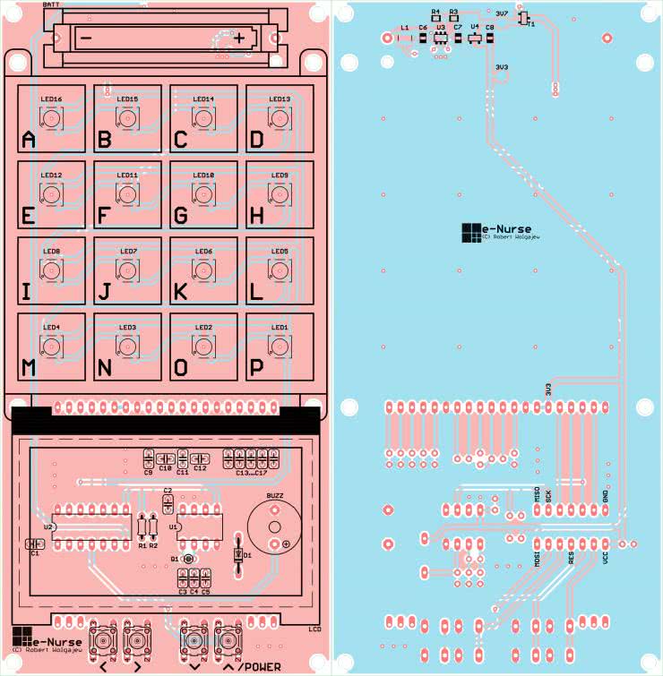 Schemat płytki PCB naszego urządzenia pokazano na rysunku 5. Jak widać, zaprojektowano bardzo zgrabną, dwustronną płytkę drukowaną ze zdecydowaną przewagą elementów THT montowanych po obu stronach laminatu (po stronie BOTTOM montowane są wyłącznie elementy SMD). Montaż urządzenia rozpoczynamy od warstwy BOTTOM, gdzie w pierwszej kolejności montujemy półprzewodniki, zaś w kolejnym kroku elementy bierne. W tym momencie przechodzimy na warstwę TOP, gdzie, podobnie jak poprzednio, w pierwszej kolejności montujemy diody LED RGB, następnie pozostałe elementy półprzewodnikowe (z wyłączeniem wyświetlacza), a na końcu elementy bierne (z wyłączeniem buzzera piezoelektrycznego) oraz elementy mechaniczne w postaci koszyczka baterii AAA czy przycisków funkcyjnych. Na koniec, do tak przygotowanego obwodu drukowanego, montujemy wyświetlacz LCD, lutując jego wyprowadzenia w przeznaczone do tego celu punkty lutownicze, co zapewni mu zarówno niezbędne połączenia elektryczne, jak i pożądaną stabilizację mechaniczną.
