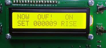 Pojemność licznika impulsów wynosi 999999. Jeżeli wartość ta zostanie przekroczona, pokaże się napis OVF! (fotografia 3) - i układ przestanie liczyć dalej, lecz przekaźnik nie zmieni swojego stanu. Dopiero wyłączenie zasilania lub wyzerowanie układu, czyli wciśnięcie przycisku S3 (ZERO) lub zwarcie zacisków złącza J3, przywraca możliwość liczenia.