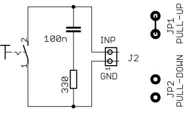 Impedancja wejściowa układu dla sygnałów o parametrach TTL jest bardzo wysoka, rzędu wielu megaomów, poza tym zakresem wynosi około 3,3 kΩ. Można ustalić rezystancję wejściową układu poprzez zastosowanie rezystora pull-up lub pull-down. Ten pierwszy załącza się poprzez nałożenie zworki JP1, zaś drugi zworką JP2. Mogą one być przydatne szczególnie wtedy, gdy chcemy wejście układu sprzęgnąć z elementem elektromechanicznym, na przykład przełącznikiem krańcowym lub ręcznym przyciskiem monostabilnym.