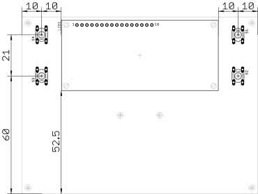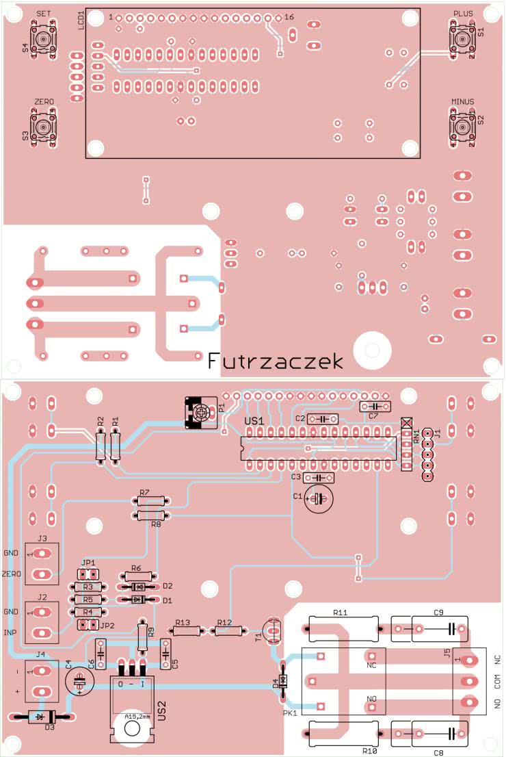 Układ został zmontowany na dwustronnej płytce drukowanej o wymiarach 120×90 mm, której schemat pokazano na rysunku 2. W odległości 3 mm od krawędzi płytki znalazły się cztery otwory montażowe, każdy o średnicy 3,2 mm. Dodatkowo, aby płytka nie uginała się podczas naciskania przycisków, w pobliżu środka płytki dodano dodatkowe otwory. Rysunek 3 pokazuje ich lokalizację na płytce.