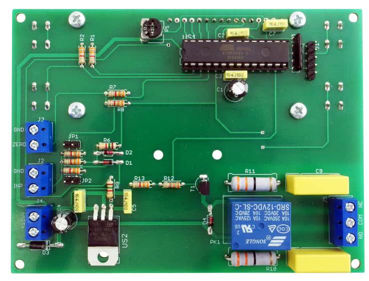 Zasilanie dla sterowanego przez układ urządzenia powinno być poprowadzone przez zaciski złącza J5, do którego są doprowadzone wyprowadzenia styków normalnie otwartych (NO) oraz normalnie zamkniętych (NC) przekaźnika PK1. Rezystor (33 Ω) i kondensator (100 nF z dielektrykiem typu X2) tworzą prosty układ pochłaniający energię wydzielaną w momencie łączenia i rozłączania styków przekaźnika, kiedy dochodzi do ich iskrzenia. Zmniejsza to ryzyko wystąpienia błędu w funkcjonowaniu układu, ponieważ redukcji ulega poziom emitowanych zakłóceń elektromagnetycznych. Zabezpieczone są w ten sposób zarówno styki NO, jak i NC.
