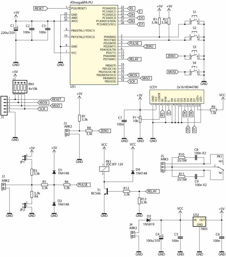 Schemat ideowy omawianego układu znajduje się na rysunku 1. Do zliczania impulsów i obsługi wyświetlacza służy mikrokontroler US1 typu ATmega8A. Nie jest to najnowszy układ, lecz pozostaje popularny i niezawodny. Nie realizuje w tym urządzeniu zadań krytycznych pod względem czasowym, więc taktowanie jego rdzenia zegarem o częstotliwości 8 MHz, którego źródłem jest wbudowany oscylator RC, całkowicie wystarcza do poprawnego działania niniejszego układu. Nieopodal jego wyprowadzeń zasilania znajdują się kondensatory C1…C3, które filtrują napięcie zasilające z tętnień. Ich źródłem mogą być zarówno tranzystory wchodzące w skład struktury US1, jak i okoliczne elementy, na przykład diody zabezpieczające wejścia.