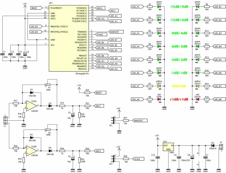 Schemat ideowy omawianego układu znajduje się na rysunku 1. Sygnał zmienny, którego poziom chcemy analizować, przed podaniem na przetwornik cyfrowo-analogowy należy wyprostować oraz wstępnie wygładzić. Służy do tego prostownik jednopołówkowy zrealizowany na tanim i popularnym wzmacniaczu operacyjnym LM358. Ponieważ dwa kanały mają identyczną topologię, szczegółowo zostanie omówiony tylko jeden z nich.
