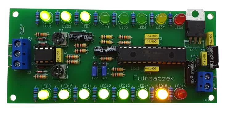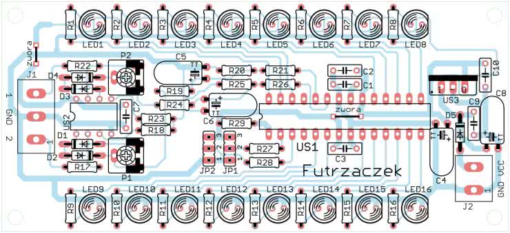 - LED8, LED16: czerwona dioda LED 5 mm matowa