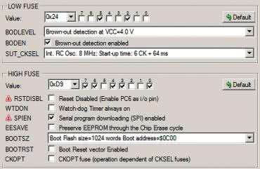 Na etapie uruchamiania jest konieczne zaprogramowanie pamięci Flash mikrokontrolera dostarczonym wsadem oraz zmiana jego bitów zabezpieczających. Oto ich nowe wartości:
