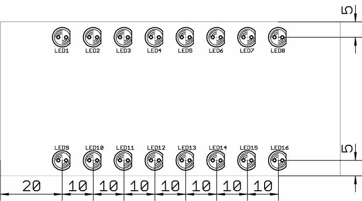 W odległości 3 mm od krawędzi płytki znalazły się cztery otwory montażowe, każdy o średnicy 3,2 mm. Rysunek 3 pokazuje rozmieszczenie diod LED na powierzchni płytki, ułatwi to wykonanie obudowy.