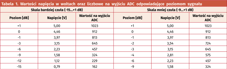 ATmega8A ma 10-bitowy przetwornik analogowo-cyfrowy, co oznacza, że dioda oznaczająca +1 dB (początek przesterowania) powinna się załączać przy maksymalnej możliwej do uzyskania przez niego wartości wyjściowej, czyli 1023. Nie ma sensu rozszerzania zakresu pomiarowego w górę, ponieważ wszystko to, co jest powyżej 0 dB, oznacza przesterowanie. Korzystając z właściwości logarytmów i prostej matematyki, powstała tabela 1, na podstawie której są załączane kolejne diody, wskazując w ten sposób chwilowy poziom sygnału. Użycie gotowej tablicy powoduje znacznie mniejsze zużycie zasobów mikrokontrolera i było wręcz konieczne, ponieważ wdrożenie funkcji obliczającej potęgę niecałkowitą powodowało zajęcie 120% pamięci mikrokontrolera…