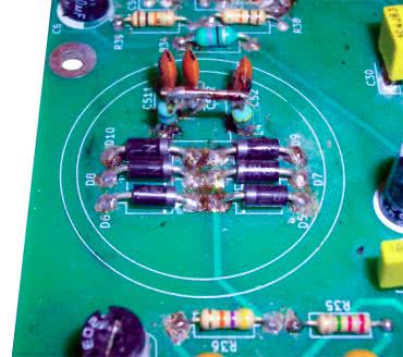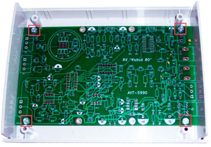 Mając wstępnie rozwiązane zagadnienie mocowania PCB w obudowie, można przystąpić do montażu i uruchomienia kluczowej części elektronicznej. Standardowo, rekomendowane jest rozpoczęcie montażu od elementów najniższych, a kończąc na najwyższych. Następnie należy przejść do uruchomienia i regulacji całości urządzenia. Autor projektu chciałby jednak zaproponować nieco alternatywne podejście. Po pierwsze, dla wygody realizacji dalszych prac montażowych faktycznie warto jest w pierwszej kolejności zalutować wszystkie rezystory stałe oraz podstawki pod układy scalone. Następnie należy wykorzystać śruby mocujące płytkę drukowaną do obudowy poprzez tymczasowe przykręcenie ich w czterech narożnych otworach PCB - w taki sposób, aby stanowiły swoisty „roboczy stojak”, zapewniający fizyczny dystans (a więc także izolację galwaniczną) względem podłoża (np. biurka), na którym wykonywane są prace montażowe i uruchomieniowe. W dalszej kolejności można przystąpić do uzupełniania (zalutowywania) brakujących elementów - jednak tylko w wybranych blokach odbiornika i - w połączeniu z następującymi po takich montażach uzupełniających - pracami uruchomieniowymi oraz niezbędnymi pomiarami kontrolnymi.