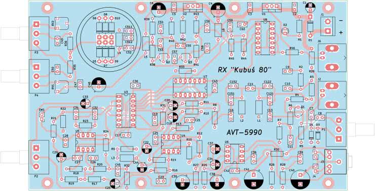 Na rysunku 2 zamieszczono schemat montażowy płytki drukowanej odbiornika. Dla ułatwienia skutecznego, poprawnego i w pełni satysfakcjonującego ukończenia konstrukcji odbiornika nasłuchowego „Kubuś”, już na etapie projektowania PCB wybrano obudowę, która spełniłaby wymagania projektowe.