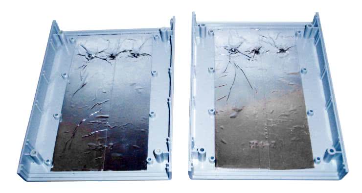 Przykładowo, pokazane na fotografii 2 mocowanie PCB do obudowy zakłada wykorzystanie czterech skrajnych otworów montażowych, dostępnych w płytce drukowanej. Już na tym etapie prac warto rozważyć aplikację prostego ekranowania wewnątrz obudowy za pomocą metalowej folii samoprzylepnej. Na fotografii 3 pokazano wnętrze obudowy w trakcie ekranowania. Wskazane jest staranne wyklejenie jak największej powierzchni wnętrza obudowy - tak aby poszczególne fragmenty metalowej folii miały połączenie galwaniczne ze sobą oraz z masą układu elektronicznego. W przykładowym rozwiązaniu wykorzystano stosunkowo niedrogą folię aluminiową produkcji dobrze znanej od lat na rynku firmy 3M, jednak lepsze rezultaty powinno przynieść zastosowanie folii miedzianej (niestety, znacznie droższej).