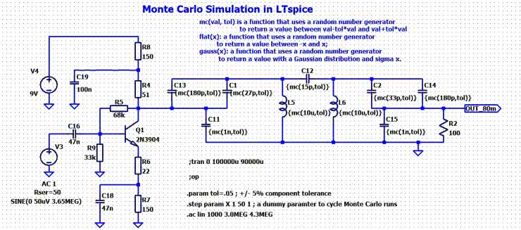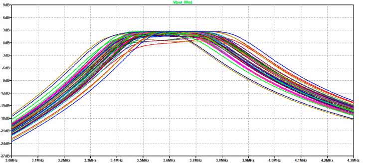 Skonfigurowany układ z rysunku 4 posłużył też do komputerowej symulacji kolejnego bloku, jakim jest pasmowy filtr w.cz. Nie była to jednak analiza stałoprądowego punktu pracy, która w tym zastosowaniu praktycznie nie ma sensu, a symulacja wpływu rozrzutu elementów LC filtru na łączną (wypadkową) charakterystykę częstotliwościową wzmacniacza i filtru. W tym celu zastosowano tzw. analizę Monte Carlo, która polega na powtarzaniu kolejnych symulacji - jednak z wybranymi parametrami losowo zmieniającymi się w dozwolonych przedziałach wartości. Na rysunku 5 można zobaczyć rezultaty takiej właśnie analizy, wykonanej w oparciu o rezultaty 50 symulacji, w trakcie których parametry wszystkich elementów LC filtru w.cz. zmieniały się losowo w zakresie maksymalnej tolerancji ±5%. Jak widać z zaprezentowanej rodziny charakterystyk, w podanych warunkach granice pasma przenoszenia wzmacniacza wstępnego i filtru w.cz. mogą przesuwać się nawet o około ±200 kHz a jego transmitancja w środku pasma fluktuuje od około 0 do +3 dB. Wniosek z rezultatów tej symulacji jest taki, że warto zastosować w filtrze w.cz. podzespoły o jak najlepszych parametrach (tj. możliwie najmniejszych tolerancjach), a idealnym rozwiązaniem byłby pomiar kontrolny wartości elementów przed montażem oraz pomiar rzeczywistych charakterystyk częstotliwościowych uruchomionego układu. Oczywiście, w przypadku zastosowania elementów LC o większych rozrzutach produkcyjnych uzyskane rezultaty byłyby jeszcze gorsze.