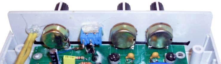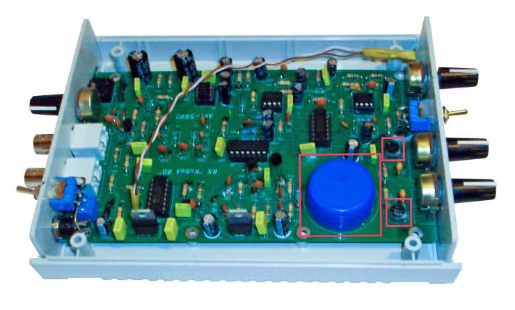 Poprawę stabilności częstotliwości pracy generatora VFO powinna zapewnić dodatkowa, prosta termoizolacja jego kluczowych elementów, odpowiedzialnych właśnie za ten parametr roboczy. Wykonano ją z wykorzystaniem zwykłej nakrętki od popularnej butelki z tworzywa sztucznego typu PET, której krawędzie uprzednio wyrównano drobnym papierem ściernym, a samą nakrętkę doklejono do PCB klejem typu BUTAPREN. Przed końcowym montażem układu w obudowie należy pochylić się nad starannym wykończeniem i mocowaniem przedniego i tylnego panelu odbiornika. Szczegóły takich rozwiązań w modelowym egzemplarzu autora projektu, widziane od strony wnętrza obudowy, pokazano na fotografii 7 (przedni panel) oraz na fotografii 8 (tylny panel).