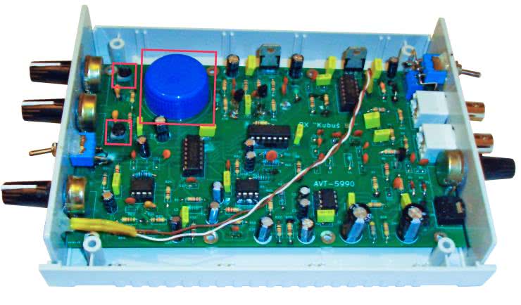 4. Sprawdzamy uzyskany zakres przestrajania częstotliwości Fvfo w skrajnych położeniach potencjometru P3. Jeśli jest on szerszy od oczekiwanego maksymalnego zakresu (3,5...3,8 MHz), to możemy go zawęzić na drodze iteracyjnych, naprzemiennych korekt ustawień potencjometrów montażowych RV1 i RV2.