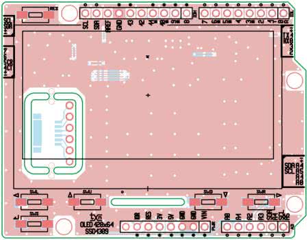 Moduł uzupełnia klawiatura analogowa. W zależności od naciśniętego przycisku SWR, SWU, SWD, SWL, SWS, zmienia się proporcja podziału napięcia IORF przez dzielnik R10, R11...R14. Sygnał KBD zmienia swoją wartość, którą można zmierzyć na wejściu analogowym A2 lub A3 (wybieranym zworą A23 na PCB podczas montażu modułu). Jeżeli nie zalutujemy zwory A23, klawiatura pozostanie odłączona od Arduino. Z myślą o ułatwieniu aplikacji modułu, na złącza I²C, D03, D47, AIO wyprowadzone zostały niewykorzystane przez wyświetlacz sygnały. Ze względu na niezbyt dużą ilość miejsca na krawędziach płytki zastosowano złącza JST-SH o rozstawie pinów 1 mm, do których dostępne są adaptery i fabryczne przewody z zaciśniętymi wtyczkami (np. QWIIC, Pololu). Dodatkowo na płytce OLED pozostawiono miejsce na wyłamywany adapter JST/SIL 2.54, ułatwiający wyprowadzenie sygnału do płytki stykowej lub prototypowej.