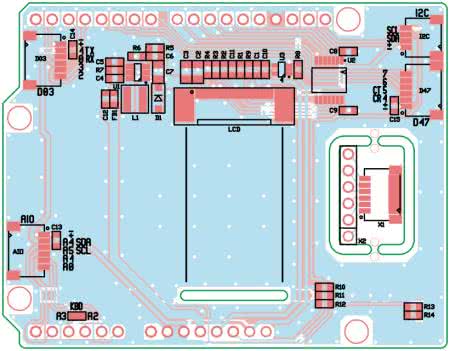 Układ zmontowany jest na dwustronnej płytce drukowanej zgodnej z Arduino Shield Rev3. Rozmieszczenie elementów zaprezentowano na rysunkach 2a, 2b.