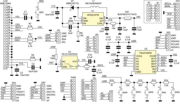 Schemat nakładki zaprezentowano na rysunku 1. Wyświetlacz GME12864 podłączony jest – za pomocą wbudowanej taśmy elastycznej – do złącza LCD, FPC o rastrze 0,5 mm i 24 wyprowadzeniach. Sterownik SSD1309 skonfigurowany jest do wymiany danych poprzez interfejs szeregowy zbliżony do SPI (z dodatkową linią sterującą wyświetlaniem DC). W celu zapewnienia zgodności z wersjami Arduino zasilanymi napięciem 3,3 V i 5 V zastosowano translator poziomów U2 typu TXU0104 (dopasowujący poziomy napięciowe sygnałów SCK, SDI, CS, DC do standardu 3,3 V wymaganego przez ekran). Sygnał restartu RES wyświetlacza buforowany jest bramką U3. Wyświetlacz OLED wymaga dostarczenia napięcia ok. 12 VDC do zasilania matrycy. Napięcie to wytwarzane jest przez przetwornicę U1 typu AP3031KTR, a jego dokładną wartość ustala dzielnik R5, R6. Rezystor R4 odpowiada za maksymalną jasność wyświetlacza.
