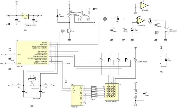 Jak widać, zaprojektowany system mikroprocesorowy jest bardzo prosty, a jego serce stanowi niewielki, ale bardzo nowoczesny mikrokontroler ATtiny1604 firmy Microchip (dawniej Atmel), taktowany wewnętrznym oscylatorem RC o częstotliwości 10 MHz i realizujący całą założoną funkcjonalność urządzenia. Mikrokontroler nasz steruje pracą szeregowego rejestru przesuwnego 74HC4094 (wyprowadzenia PA3/SCK→Clock, PA0/MOSI→Data), dzięki któremu realizuje obsługę matrycowego wyświetlacza LED w konfiguracji wspólnej anody (wyprowadzenia PA7…PA4, PA2 mikrokontrolera), obsługuje enkoder inkrementalny z wbudowanym przyciskiem (dzięki zastosowaniu przerwania od zmiany stanu pinów portu PORTB mikrokontrolera - w naszym przypadku pinu PB1), steruje pracą przekaźnika LOAD (poprzez prosty klucz tranzystorowy NPN) oraz odpowiedzialny jest za generowanie dźwięku poprzez wbudowany głośniczek SMD, co realizuje za pomocą wbudowanych w swoją strukturę układów czasowo-licznikowych: TCA0 (pracującego w trybie PWM) oraz TCB0 (pracującego w trybie Periodic Interrupt). Wybór mikrokontrolera ATtiny1604 oraz podłączonego do jego wyprowadzeń rejestru szeregowego 74HC4094 mógłby się wydawać dość wątpliwy, jeśli wziąć pod uwagę, że bez problemu dałoby się tu wybrać mikrokontroler o odpowiedniej liczbie portów wyjściowych, zamiast stosować procesor i rejestr przesuwny. To tylko pozory! Po pierwsze, nie chciałem stosować mikrokontrolera o większej liczbie (niepotrzebnych) wyprowadzeń, a co za tym idzie - o niewygodnej do lutowania dla amatora obudowie (TQFP32). Jeszcze istotniejszy jest jednak fakt, że zastosowanie rejestru przesuwnego 74HC4094 zdecydowanie upraszczało projekt obwodu drukowanego (tak, tak!); nie wspominając już o cenie układu tego rodzaju, wynoszącej około 1 zł. Co warto również zaznaczyć, do sterowania rejestru przesuwnego używany jest wbudowany w strukturę mikrokontrolera interfejs SPI, przez co jego obsługa stała się niezmiernie prosta i szybka (zegar SPISCK=5 MHz).