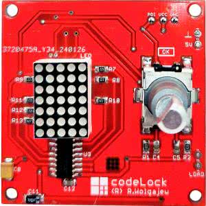 Omówmy jeszcze kwestię obsługi naszego urządzenia. Tu sprawa jest niezmiernie prosta. W chwili bezczynności i oczekiwania na rozpoczęcie wprowadzania kodu urządzenie wyświetla znak „↔” (ale w pionie). Pokręcanie osią enkodera powoduje stosowną zmianę cyfr na wyświetlaczu LED, okraszoną bardzo efektowną animacją (przekręcania się „bębna” z cyframi), z towarzyszącym jej dźwiękiem tykania. Wciśnięcie ośki enkodera powoduje z kolei zatwierdzenie bieżącej cyfry i przejście do kolejnego kroku, który wygląda dokładnie tak samo. Wprowadzenie 4 cyfr kodu inicjuje jego sprawdzenie i - w przypadku zgodności z zapamiętanym - powoduje chwilowe pokazanie znaku „+” (okraszone specjalnym efektem dźwiękowym „ding”) oraz załączenie przekaźnika LOAD, po czym urządzenie przechodzi do stanu wyjściowego, czyli do początku wprowadzania kodu użytkownika (wyświetlając znak „↔” (w pionie)). Z kolei, jeśli wprowadzony kod nie zgadza się z kodem użytkownika, urządzenie pokaże znak „–”, po czym odtworzy dźwięk błędu i przejdzie, jak poprzednio, do początku wprowadzania tegoż kodu (wyświetlając znak „↔” (w pionie)). Tutaj nasuwa się pytanie: w jaki sposób wprowadzamy kod użytkownika, który ma zostać zapamiętany przez urządzenie (a następnie sprawdzany)? Również bardzo prosto. Jest to możliwe wyłącznie podczas włączania urządzenia. Jeśli podczas rozruchu wciśnięty będzie przycisk enkodera, układ przejdzie do trybu wprowadzania kodu użytkownika. Sam proces wprowadzania tego kodu wygląda dokładnie tak samo, jak normalna obsługa urządzenia, podczas której oczekuje ono na wpisanie kolejnych 4 cyfr kodu, ale z małym wyjątkiem. Otóż, podczas normalnego użytkowania urządzenia, czyli podczas wpisywania kodu do sprawdzenia, mikrokontroler odlicza czas bezczynności użytkownika (10 s), po upływie którego kasowane są wszystkie podane dotąd cyfry i proces wprowadzania startuje od nowa. W przypadku trybu wprowadzania kodu użytkownika wspomniany czas bezczynności nie ma zastosowania, w związku z czym urządzenie nie przejdzie do normalnego trybu pracy, dopóki nie zostanie wpisany cały kod użytkownika (4 cyfry). Po zakończeniu tej czynności nowy kod zapamiętany zostanie w pamięci EEPROM mikrokontrolera, zaś urządzenie przejdzie do trybu normalnego.