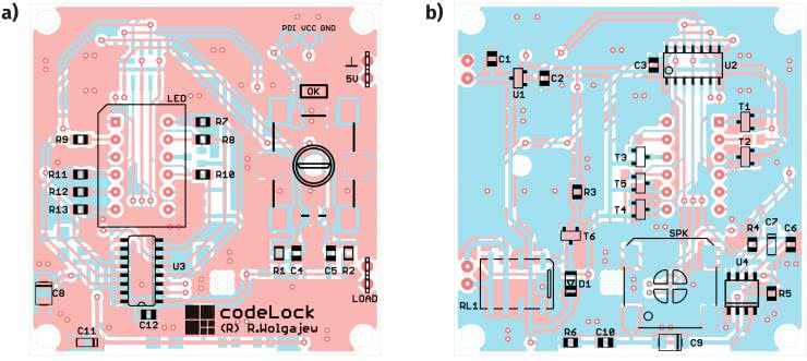 Jak widać, zaprojektowano bardzo zgrabną, dwustronną, niewielką płytkę drukowaną ze zdecydowaną przewagą elementów SMD umieszczonych po obu stronach laminatu. Montaż urządzenia rozpoczynamy od warstwy TOP, na której w pierwszej kolejności przylutowujemy wszystkie półprzewodniki, w tym wyświetlacz LED. Proces ten najłatwiej wykonać przy użyciu stacji lutowniczej na gorące powietrze (tzw. Hot-Air) i odpowiednich stopów lutowniczych. Jeśli jednak nie dysponujemy tego rodzaju sprzętem, można również zastosować metodę z wykorzystaniem typowej stacji lutowniczej. Najprostszym sposobem montażu elementów o tak dużym zagęszczeniu wyprowadzeń, niewymagającym jednocześnie posiadania specjalistycznego sprzętu, jest użycie zwykłej stacji lutowniczej, dobrej jakości cyny z odpowiednią ilością topnika oraz dość cienkiej plecionki rozlutowniczej, która umożliwi usunięcie nadmiaru cyny spomiędzy wyprowadzeń układów. Należy przy tym uważać, by nie uszkodzić termicznie tego rodzaju elementów. Następnie lutujemy elementy bierne, po czym przechodzimy na warstwę BOTTOM. Tutaj, podobnie jak poprzednio, montaż rozpoczynamy od przylutowania wszystkich półprzewodników (w tym układów scalonych), po czym montujemy pozostałe elementy bierne, następnie głośniczek SMD oraz przekaźnik. W tym momencie wracamy na warstwę TOP, gdzie przylutowujemy enkoder SMD. To etap, na którym urządzenie gotowe jest do uruchomienia. Na fotografii 1 pokazano zmontowane urządzenie codeLock od strony warstwy TOP, zaś na fotografii 2 - od strony warstwy BOTTOM.