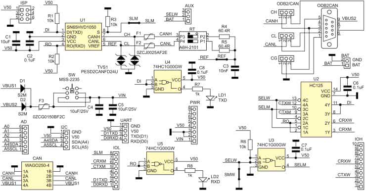 Schemat nakładki pokazano na rysunku 2. Aplikację SN65HVD1050 uzupełniają elementy zabezpieczające U1 oraz terminujące magistralę CAN. Dioda TVS1 zabezpiecza transceiver przed skutkami przepięć, a bezpieczniki polimerowe F1, F2 – przed skutkami zwarć magistrali. Przełącznik RT umożliwia odłączenie rezystorów terminujących R4, R5, gdy nakładka jest nie jest „skrajnym” urządzeniem magistrali CAN. Sposób terminacji i aktywację napięcia VREF można dostosować do wymogów aplikacji. Domyślnie przy użyciu rezystorów R4, R5 i kondensatora C3 realizowany jest schemat terminacji dzielonej, z możliwością zastosowania napięcia VREF=VCC/2 układu U1 w celu stabilizacji punktu pracy trybu współbieżnego (CM) po zwarciu zwory REF. Usuwając kondensator C3 i zworę REF wdrażamy schemat terminacji standardowej z obciążeniem magistrali wyłącznie rezystancją R4+R5≈120 Ω.