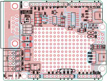 Układ zmontowany został na dwustronnej płytce drukowanej zgodnej z Arduino Shield Rev3. Rozmieszczenie elementów pokazano na rysunku 3.