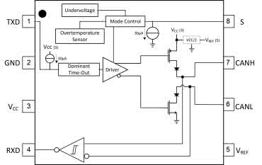 Układ zawiera wszystko, co jest konieczne do spełnienia wymogów standardów CAN zgodnie z normą ISO11898-2, a jego aplikacja ogranicza się do zaledwie kilku elementów zewnętrznych.