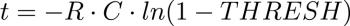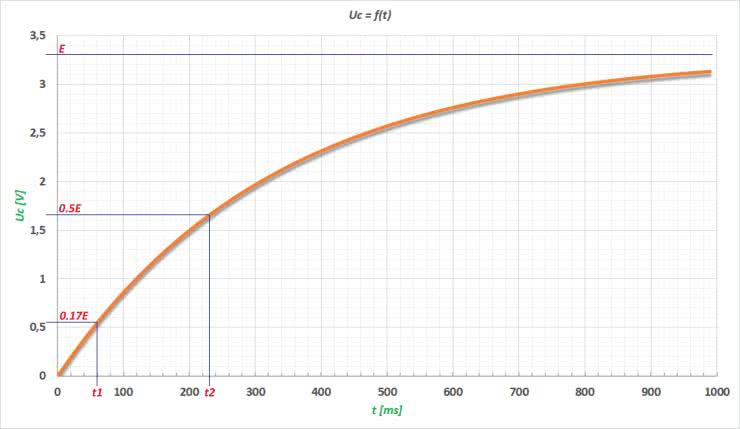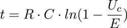Jak widać, jeśli przyjmiemy stałe wartości E oraz R, napięcie na zaciskach mierzonego kondensatora zależne będzie wyłącznie od jego pojemności (C) oraz czasu ładowania (t). Z powyższego wzoru możemy wyznaczyć czas ładowania dla konkretnego napięcia Uc, który wyraża się następującym wzorem: