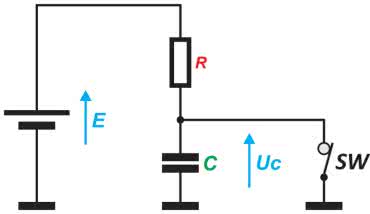 W obwodzie z rysunku 1 otwarcie przełącznika SW rozpoczyna proces ładowania kondensatora, podczas którego napięcie na zaciskach kondensatora wyraża się następującym wzorem: