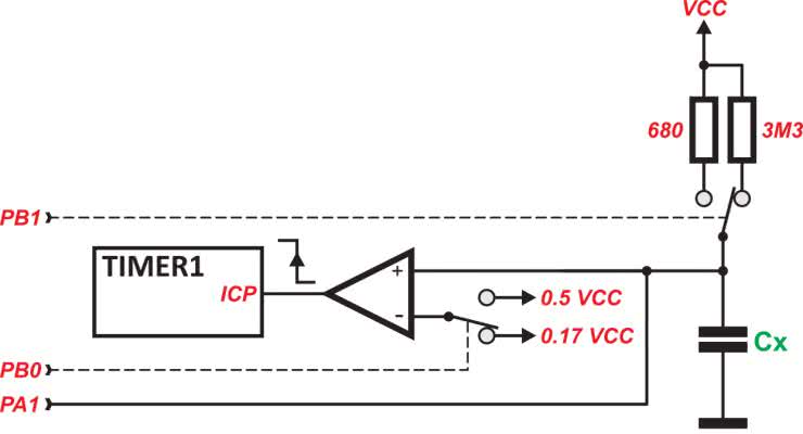 - steruje zewnętrznymi obwodami pomiarowymi (wyprowadzenie PB1 jest odpowiedzialne za wybór wartości rezystora szeregowego [3,3 MΩ lub 680 Ω], zaś PB0 umożliwia wybór napięcia referencyjnego [0,17 VCC lub 0,5 VCC]),