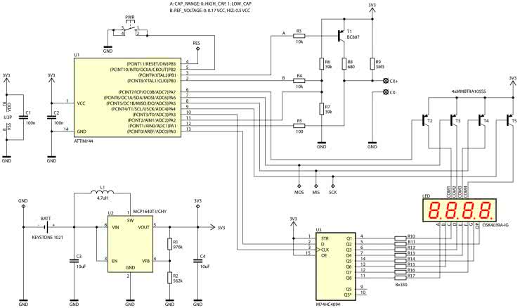 Wybór mikrokontrolera ATtiny44 oraz podłączonego do jego wyprowadzeń rejestru szeregowego 74HC4094 mógłby się wydawać dość wątpliwy, jeśli bierzemy pod uwagę, że bez problemu można byłoby wybrać mikrokontroler o odpowiedniej liczbie portów wyjściowych, zamiast stosować przedmiotowy mikrokontroler i dodatkowy rejestr przesuwny. To jednak tylko pozory! Nie chciałem bowiem stosować mikrokontrolera o większej liczbie (niepotrzebnych) wyprowadzeń, a co za tym idzie – o niewygodnej do lutowania dla amatora obudowie (TQFP32). Istnieje jednak drugi, ważniejszy powód: zastosowanie rejestru przesuwnego 74HC4094 zdecydowanie upraszczało projekt obwodu drukowanego, a układ tego rodzaju kosztuje około 1,50 zł. Wspomniane wcześniej wspólne anody wyświetlacza LED sterowane są poprzez proste klucze tranzystorowe T2…T5 z uwagi na dość duże prądy o wartościach rzędu 32 mA (8×4 mA na segment). Z kolei katody naszych elementów LED obsługiwane są przez wyprowadzenia rejestru przesuwnego i, jak już można się domyślić, do ich obsługi (podobnie jak wspólnych anod) zastosowano doskonale znany mechanizm multipleksowania. Jest to typowe rozwiązanie problemu tego typu, a polega na sekwencyjnym sterowaniu kolejnych cyfr wyświetlacza LED. Wspomniana procedura, wykonywana dostatecznie szybko (w naszym wypadku 60 razy na sekundę dla każdej wspólnej anody), pozwala na obsłużenie 32 segmentów wyświetlacza LED przy udziale wyłącznie 6 wyprowadzeń mikrokontrolera. Już teraz nadmienię, że użyjemy w tym celu układu czasowo-licznikowego Timer0 wbudowanego w strukturę mikrokontrolera, który pracował będzie w trybie CTC i wywoływał stosowne przerwanie systemowe (od porównania) 240 razy na sekundę (czyli 60 razy dla każdej wspólnej anody), obsługując właściwy mechanizm multipleksowania. Wróćmy jednak do schematu ideowego naszego urządzenia, gdyż kilku niezbędnych słów wyjaśnienia wymaga blok zasilający. Zdecydowałem się na zastosowanie popularnej baterii typu AAA o pojemności w granicach 1300 mAh (w przypadku dobrych baterii alkalicznych lub litowych), a wybór ten podyktowany był łatwą dostępnością ogniw i ich niską ceną. Z uwagi na to konieczne stało się użycie prostej, acz nowoczesnej przetwornicy step-up pod postacią układu scalonego MCP1640 firmy Microchip, która dostarcza napięcie wyjściowe rzędu 3,3 V (regulowane dzielnikiem rezystancyjnym) już przy napięciu wejściowym na poziomie 0,65 V i zapewnia niski prąd spoczynkowy w granicach 1 μA oraz wysoką sprawność, co nie jest bez znaczenia dla typu zastosowanego źródła napięcia zasilającego. Aby ocenić, jak długo urządzenie cMeter pracować będzie na pojedynczej baterii AAA, należy zastanowić się, z jakich etapów składa się cykl jego pracy i jakiej wielkości prądy pobiera wtedy ze źródła zasilania. Przystępując do obliczeń, przyjąłem następujący podział cyklu pracy urządzenia: