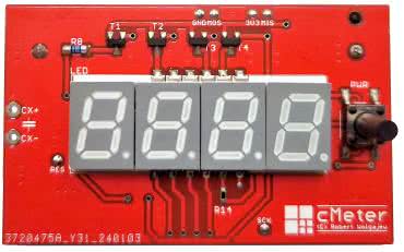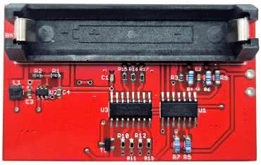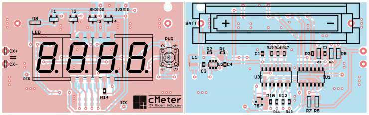 Jak widać, zaprojektowano bardzo zgrabną, dwustronną, niewielką płytkę drukowaną ze zdecydowaną przewagą elementów SMD lutowanych po obu stronach laminatu. Montaż urządzenia rozpoczynamy od warstwy TOP, na której w pierwszej kolejności przylutowujemy wszystkie półprzewodniki, w tym wyświetlacz LED. Proces ten najłatwiej wykonać przy użyciu stacji lutowniczej na gorące powietrze (tzw. Hot-Air) i odpowiednich stopów lutowniczych. Jeśli jednak nie dysponujemy tego rodzaju sprzętem, można również zastosować metodę z użyciem typowej stacji lutowniczej. Najprostszym sposobem montażu elementów o tak dużym zagęszczeniu wyprowadzeń, niewymagającym jednocześnie posiadania specjalistycznego sprzętu, jest zastosowanie zwykłej stacji lutowniczej, dobrej jakości cyny z odpowiednią ilością topnika oraz dość cienkiej plecionki rozlutowniczej, która umożliwi usunięcie nadmiaru cyny spomiędzy wyprowadzeń układów. Należy przy tym uważać, by nie uszkodzić termicznie tego rodzaju elementów. Następnie lutujemy elementy bierne, po czym przechodzimy na warstwę BOTTOM. Tutaj, podobnie jak poprzednio, montaż rozpoczynamy od przylutowania wszystkich półprzewodników (w tym układów scalonych), po czym montujemy pozostałe elementy bierne oraz gniazdo baterii AAA. W tym momencie wracamy na warstwę TOP, gdzie przylutowujemy przycisk PWR. Na tym etapie urządzenie gotowe jest do uruchomienia. Na fotografii 1 pokazano zmontowane urządzenie cMeter od strony warstwy TOP, zaś na fotografii 2 – to samo urządzenie od strony warstwy BOTTOM.