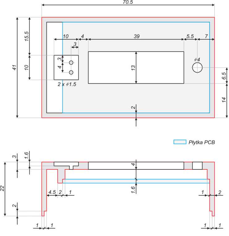 Omówiliśmy zagadnienia związane z obsługą, przejdźmy zatem do nie mniej ciekawych kwestii dotyczących obudowy urządzenia. Przystępując do prac projektowych, przygotowałem stosowny projekt 2D, którego rysunek z zaznaczeniem wszystkich niezbędnych wymiarów pokazano na rysunku 6.