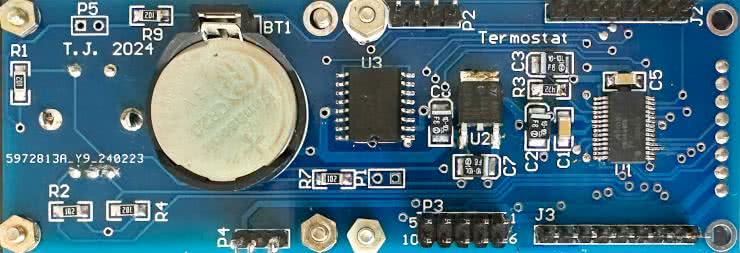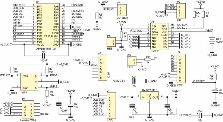 Zegar RTC typu DS3231 (U3) komunikuje się z mikrokontrolerem przez magistralę I²C. Rezystory R5 i R6 zapewniają wymagane przez standard I²C podciąganie linii SDA i SCL do plusa zasilania 3,3 V. Po zaniku głównego napięcia +3,3 V układ zegara jest zasilany z baterii litowej CR2032 o napięciu 3 V. Na płytce sterownika jest umieszczone specjalne gniazdo do zamocowania tej baterii, co pozwala podtrzymać bieg układu czasowego i niweluje problem konieczności ponownego ustawiania aktualnej godziny po zaniku napięcia sieciowego. Napięcie o wartości 3,3 V, służące do zasilania układów mikrokontrolera, wyświetlacza graficznego i zegara RTC, jest wytwarzane przez scalony stabilizator LDO (U2) typu 1117-3.3 Na wejście stabilizatora jest podawane napięcie +5 V z płytki zasilacza przez złącze szpilkowe P3. Czujnik temperatury jest podłączany do wyprowadzeń złącza P4, a rezystor R8 realizuje wymagane przez standard 1-Wire podciąganie linii danych DQ do plusa zasilania. Złącze J2 umożliwia podłączenie programatora/debuggera PicKit4. Do programowania układu jest wykorzystywana jedna dwukierunkowa linia UPDI.