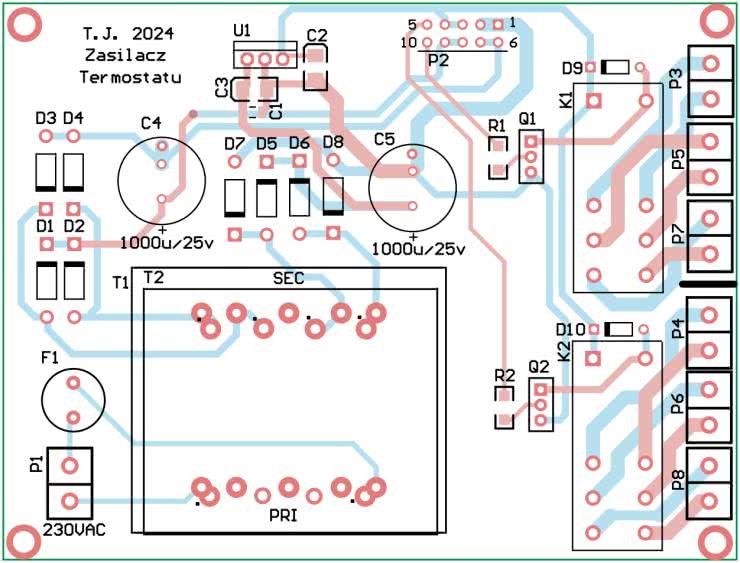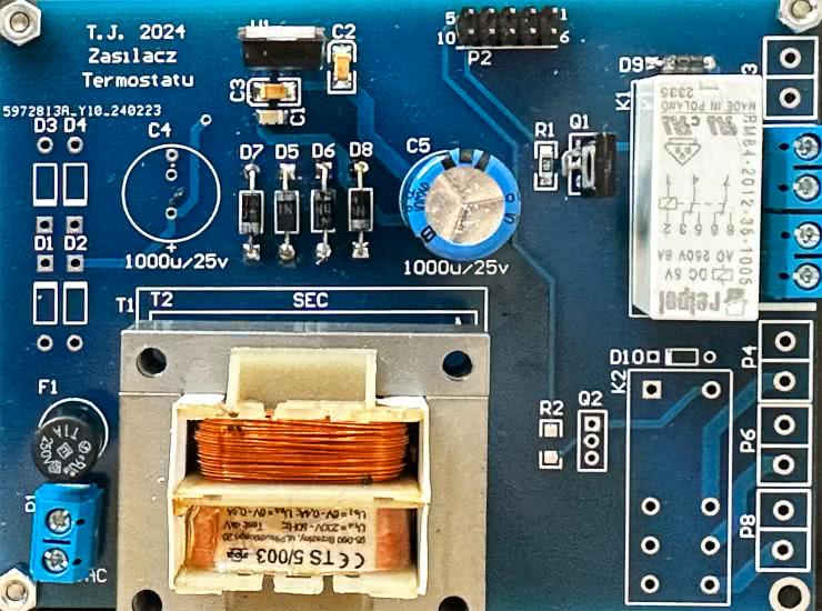 Zastosowany transformator ma dwa uzwojenia wtórne o napięciach nominalnych 6 V każde. Jedno z nich nie jest wykorzystywane w termostacie, ale na płytce przewidziano miejsce na jeszcze jeden mostek prostowniczy i kondensator filtrujący. Tych elementów nie trzeba montować w standardowej wersji opisywanego urządzenia.