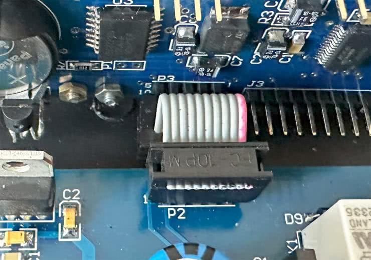 Gotowe płytki zostały umieszczone w małej, plastikowej obudowie. Połączone są za pomocą złączy IDC10 zaciskanych na płaskim kablu AWG28 (fotografia 3). To połączenie umożliwia zasilanie płytki sterownika napięciem +5 V i przesyłanie sygnału sterującego ze sterownika do tranzystora sterującego przekaźnikiem wykonawczym.