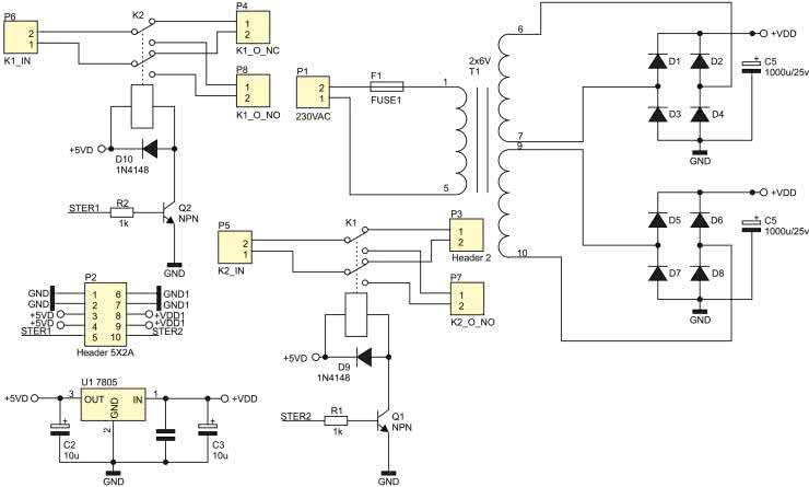 Napięcie sieciowe 230 V jest podłączone przez złącze P1 i bezpiecznik F1 do uzwojenia pierwotnego transformatora sieciowego T1. Napięcie wtórne o nominalnej wartości skutecznej 6 V jest prostowane w mostku Greatza zbudowanym z diod D5...D8 typu 1N4007 i filtrowane kondensatorem C5 o pojemności 1000 μF. Wyprostowane i odfiltrowane napięcie trafia na wejście stabilizatora U1 typu uA7805. Napięcie +5 V z jego wyjścia zasila (poprzez złącze P2) układy płytki sterownika oraz cewki przekaźników wykonawczych K1 i K2, które odpowiedzialne są za sterowanie załączaniem/wyłączaniem pieca. Przewidziano dwa kanały sterujące z dwoma przekaźnikami, ale w obecnej wersji w użyciu jest tylko jeden kanał. Cewki przekaźników są sterowane tranzystorami Q1 i Q2. Podanie napięcia +3,3 V z portu mikrokontrolera (przez rezystory ograniczające R1 lub R2) na bazy tranzystorów sterujących powoduje wprowadzenie ich w stan nasycenia i zadziałanie przekaźnika. Diody D9 i D10 tłumią przepięcia indukowane w cewkach przekaźników w momencie wyłączania napięcia i zaniku prądu płynącego przez uzwojenia cewek.
