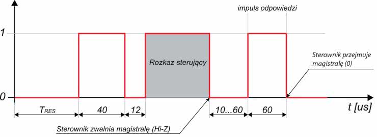 - po upływie 5 μs ustawia wejście własnego interfejsu komunikacyjnego (DIN) w tryb wyjścia, by po kolejnych 10 μs przesłać impuls dodatni, którego długość zależy od typu oczekiwanej odpowiedzi (o czym pisałem wcześniej, omawiając znaczenie pola respType).