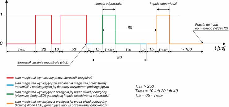 Po wyemitowaniu powyższej sekwencji sygnałów sterownik powinien zwolnić magistralę danych, ustawiając swój port komunikacyjny w tryb wejścia (Hi-Z) i – po odczekaniu 5 μs – rozpocząć odczytywanie impulsów sterujących, które z kolei powinny być wysyłane przez kolejne diody LED w łańcuchu. Dokładnie w tym samym czasie, gdy sterownik zwalnia magistralę danych (czyli po ostatnim zboczu opadającym sekwencji sygnałów z rysunku 4), pierwsza dioda LED w szeregu wykonuje jednocześnie dwie czynności: