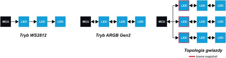 Zacznijmy od początku. Elementy LED standardu ARGB Gen2 są adresowalnymi diodami LED, zgodnymi z dobrze znanym standardem diod WS2812 i podobnych. Znaczy to ni mniej, ni więcej tyle, że sterowane protokołem diody WS2812 będą zachowywały się zgodnie ze swoim pierwowzorem. Jednak diody ARGB Gen2 udostępniają bardzo ciekawe rozszerzenia protokołu WS2812, dzięki czemu możemy nimi sterować w jeszcze bardziej elastyczny sposób. Wystarczy wspomnieć, że każdy element ARGB Gen2 możemy zarówno indywidualnie konfigurować, gdyż ma on specjalny rejestr modyfikujący pewne ustawienia sprzętowe – jak i odczytywać niektóre dane w nim zapisane (tak naprawdę w zasadzie tylko 2). Tak, tak, nie przesłyszeliście się, interfejs komunikacyjny diod ARGB Gen2 pozwala na dwukierunkową komunikację! Co więcej, protokół komunikacyjny tychże elementów LED wyposażono w możliwość pracy wielu łańcuchów diod LED połączonych w topologii gwiazdy, sterowanych – UWAGA – niezależnie, przez ten sam mikrokontroler. Graficzną prezentację dostępnych trybów pracy diod ARGB Gen2 pokazano na rysunku 1.