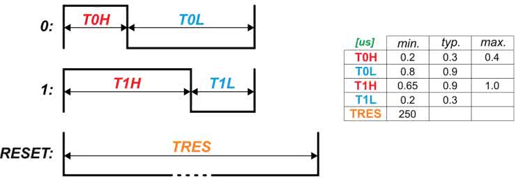Podstawowy tryb pracy to tryb zgodny ze standardem WS2812. W tym przypadku mamy do czynienia z asynchronicznym interfejsem komunikacyjnym, w którym nie ma wyprowadzenia sygnału zegarowego, w związku z czym dane przesyłane przy jego użyciu muszą być w pewien sposób zakodowane, by możliwe stało się ich proste zdekodowanie i by zyskały one odporność na zakłócenia czy artefakty. Zastosowano tutaj mechanizmy dobrze znane z interfejsów bezprzewodowej transmisji danych stosowanych w torach podczerwieni, gdzie stany logiczne „1” i „0” zakodowane zostały długością impulsu. Dodatkowo wprowadzono tak zwany sygnał RESET (również zakodowany długością impulsu), który powoduje zresetowanie interfejsów komunikacyjnych sterowników diod LED i ich oczekiwanie na nowe dane. Na rysunku 2 pokazano przebiegi sygnałów interfejsu komunikacyjnego diody SK6112-RG-002 w trakcie transmisji bitu logicznej „1”, logicznego „0” i sygnału RESET.