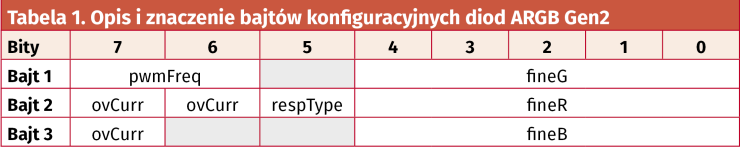 Co ważne, powyższa sekwencja retransmitowana jest do kolejnych diod w łańcuchu (są dla niej niejako „przezroczyste”), przez co – po jej wysłaniu przez sterownik – wszystkie diody w tymże łańcuchu przechodzą w tryb konfiguracji. Następnie, po odczekaniu czasu sygnału RESET, sterownik powinien wysłać 3 bajty danych na każdą diodę LED, tak jak to miało miejsce w przypadku standardu WS2812, przy czym wspomniane 3 bajty danych nie zostaną przez każdą z nich zinterpretowane jako wartości RGB, tylko jako bajty konfiguracyjne. Ich znaczenie dla konfiguracji elementu LED, określone empirycznie, zebrano w tabeli 1.