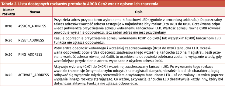 Co ważne i oczywiste, powyższa sekwencja sygnałów odbierana jest jednocześnie przez pierwsze diody w poszczególnych łańcuchach, przez co – po jej wysłaniu przez sterownik – każda ze wspomnianych diod przejmuje rolę bramki. Wynika z tego, że tym razem nie jest ona również dostępna dla pozostałych diod w danym łańcuchu – z wyjątkiem wspomnianej bramki. W dalszym kroku, po wyemitowaniu powyższej sekwencji, należy wysłać jeden bajt danych, stanowiący rozkaz sterujący (z opcjonalnym adresem umieszczonym na 4 najmłodszych bitach) – przy czym sposób jego transmisji jest identyczny, jak to miało miejsce w przypadku standardu WS2812. Dalej, w przypadku wybranych rozkazów sterujących, oczekiwana może być odpowiedź bramki, która polega na wygenerowaniu przez nią dodatniego impulsu (60 μs) na magistrali danych, w czasie od 10 μs do 60 μs, licząc od końca transmisji rozkazu. Takie działanie sprawia, że – podobnie jak to miało miejsce w trybie odczytu – po wyemitowaniu powyższej sekwencji sygnałów sterownik powinien zwolnić magistralę danych, ustawiając swój port komunikacyjny w tryb wejścia (Hi-Z). Następnie musi rozpocząć odczytywanie impulsu odpowiedzi, który z kolei powinien być wysyłany przez bramkę (pamiętajmy: tylko dla wybranych rozkazów). Listę dostępnych rozkazów wraz z opisem ich znaczenia dla protokołu ARGB Gen2 pokazano w tabeli 2.